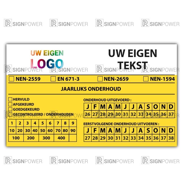 In de categorie keuringsstickers met uw logo én tekst is de brandblusser sticker met eigen tekst en logo een veel gebruikte zelfklevende sticker. Het is volgens de wet vereist dat een bewijs van de uitgevoerde keuring op de werkplek aanwezig moet zijn. Een keuringsstickers met uw logo én tekst gemaakt van een (matte) niet scheurbaar PP vinyl is daarvoor de meest praktische oplossing. Indien de sticker in aanraking komt met vocht adviseren wij een laminaatlaag over de stickers te laten aanbrengen, dit verlengt tevens de levensduur van de stickers.
