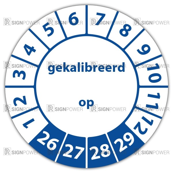 De keuringssticker "gekalibreerd op" heeft een diameter van 20mm, 30mm of 40mm. U kunt tevens kiezen voor een begin jaartal en het aantal keuringsstickers op rol.