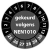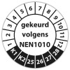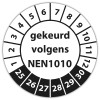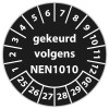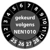 De keuringssticker "gekeurd volgens nen 1010" heeft een diameter van 20mm, 30mm of 40mm. U kunt tevens kiezen voor een begin jaartal en het aantal keuringsstickers op vel.