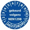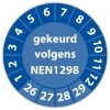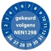 De keuringssticker "gekeurd volgens nen 1298" heeft een diameter van 20mm, 30mm of 40mm. U kunt tevens kiezen voor een begin jaartal en het aantal keuringsstickers op vel.