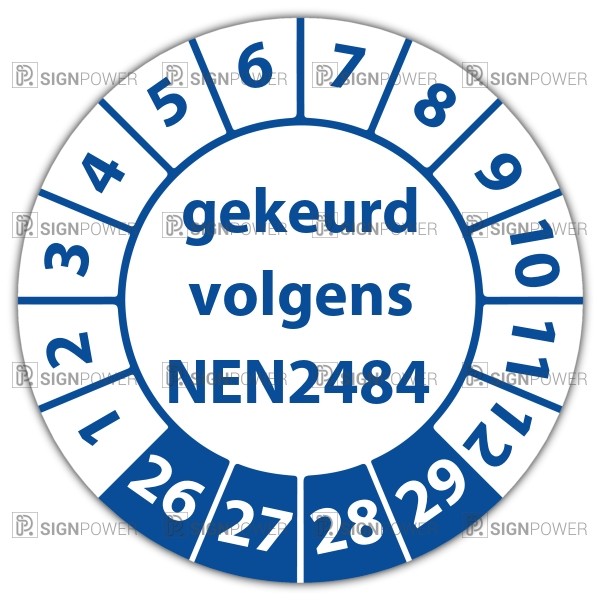 De keuringssticker "gekeurd volgens nen 2484" heeft een diameter van 20mm, 30mm of 40mm. U kunt tevens kiezen voor een begin jaartal en het aantal keuringsstickers op vel.