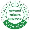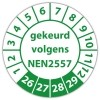 De keuringssticker "gekeurd volgens nen 2557" heeft een diameter van 20mm, 30mm of 40mm. U kunt tevens kiezen voor een begin jaartal en het aantal keuringsstickers op rol.