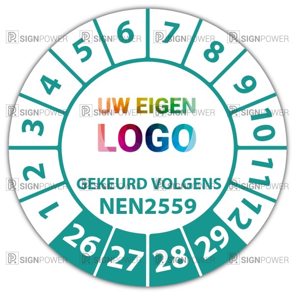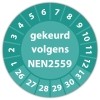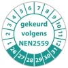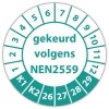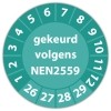 De keuringssticker "gekeurd volgens nen 2559" heeft een diameter van 20mm, 30mm of 40mm. U kunt tevens kiezen voor een begin jaartal en het aantal keuringsstickers op rol.