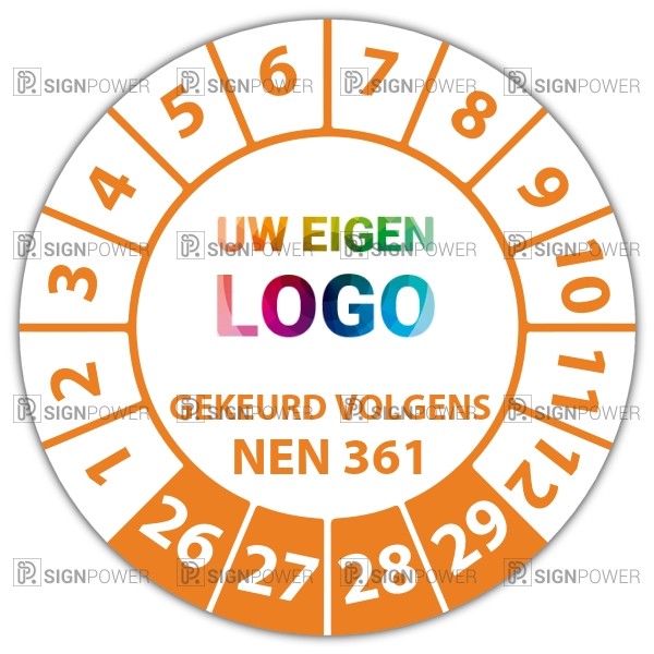 In de categorie keuringsstickers nen-normen is de keuringssticker "gekeurd volgens nen 361" een veel gebruikte zelfklevende sticker. Het is volgens de wet vereist dat een bewijs van de uitgevoerde keuring op de werkplek aanwezig moet zijn. Een keuringsstickers nen-normen gemaakt van een (matte) niet scheurbaar PP vinyl is daarvoor de meest praktische oplossing. Indien de sticker in aanraking komt met vocht adviseren wij een laminaatlaag over de stickers te laten aanbrengen, dit verlengt tevens de levensduur van de stickers.