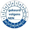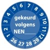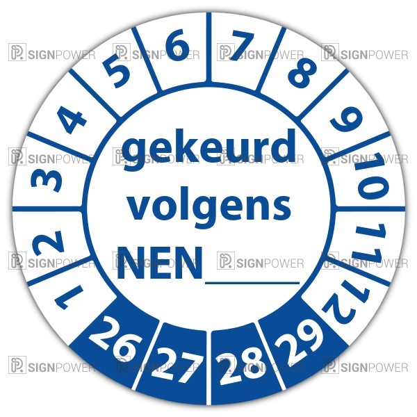 De keuringssticker gekeurd volgens nen-norm (eigen invoer) heeft een diameter van 20mm, 30mm of 40mm. U kunt tevens kiezen voor een begin jaartal en het aantal keuringsstickers op rol.