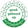 In de categorie keuringsstickers op rol is de keuringssticker "goedgekeurd op" een veel gebruikte zelfklevende sticker. Het is volgens de wet vereist dat een bewijs van de uitgevoerde keuring op de werkplek aanwezig moet zijn. Een keuringsstickers op rol gemaakt van een (matte) niet scheurbaar PP vinyl is daarvoor de meest praktische oplossing. Indien de sticker in aanraking komt met vocht adviseren wij een laminaatlaag over de stickers te laten aanbrengen, dit verlengt tevens de levensduur van de stickers.
