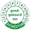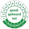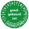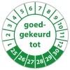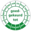 In de categorie keuringsstickers op rol is de keuringssticker "goedgekeurd tot" een veel gebruikte zelfklevende sticker. Het is volgens de wet vereist dat een bewijs van de uitgevoerde keuring op de werkplek aanwezig moet zijn. Een keuringsstickers op rol gemaakt van een (matte) niet scheurbaar PP vinyl is daarvoor de meest praktische oplossing. Indien de sticker in aanraking komt met vocht adviseren wij een laminaatlaag over de stickers te laten aanbrengen, dit verlengt tevens de levensduur van de stickers.