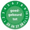 De keuringssticker "goedgekeurd tot" heeft een diameter van 20mm, 30mm of 40mm. U kunt tevens kiezen voor een begin jaartal en het aantal keuringsstickers op rol.