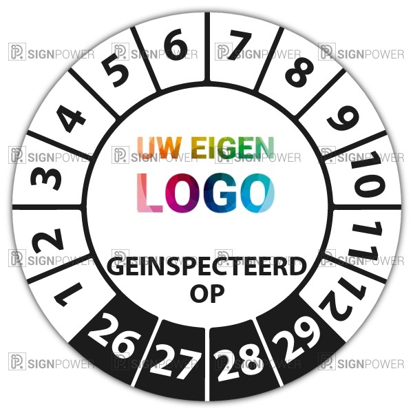 Ook voor de keuringssticker ultra destructable "geinspecteerd op" geldt dat u gratis uw eigen logo kan laten meedrukken, upload online uw logo en zie direct live de digitale drukproef.
