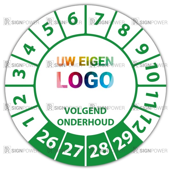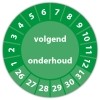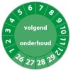 De keuringssticker "volgend onderhoud" heeft een diameter van 20mm, 30mm of 40mm. U kunt tevens kiezen voor een begin jaartal en het aantal keuringsstickers op rol.