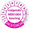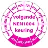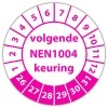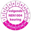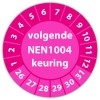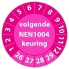 De keuringssticker "volgende nen 1004 keuring" heeft een diameter van 20mm, 30mm of 40mm. U kunt tevens kiezen voor een begin jaartal en het aantal keuringsstickers op rol.