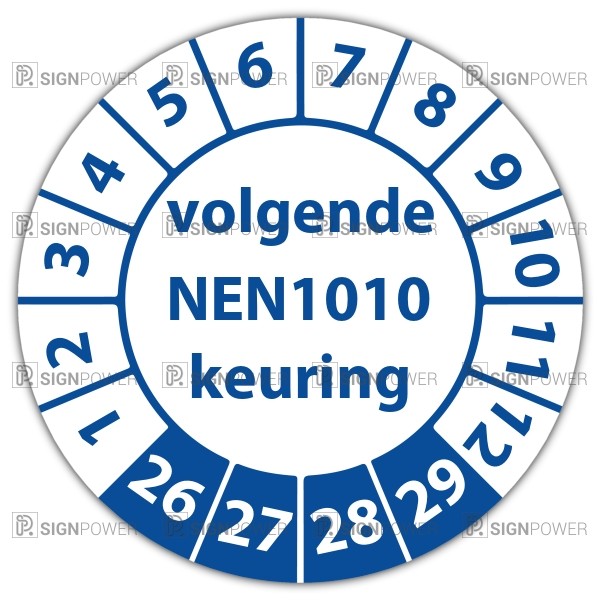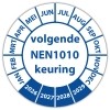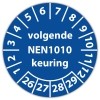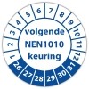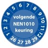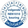 De keuringssticker "volgende nen 1010 keuring" heeft een diameter van 20mm, 30mm of 40mm. U kunt tevens kiezen voor een begin jaartal en het aantal keuringsstickers op vel.