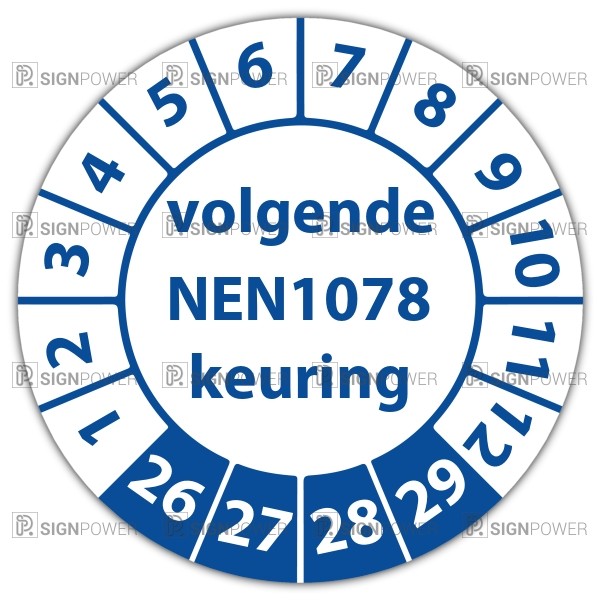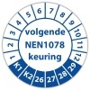 De keuringssticker "volgende nen 1078 keuring" heeft een diameter van 20mm, 30mm of 40mm. U kunt tevens kiezen voor een begin jaartal en het aantal keuringsstickers op rol.