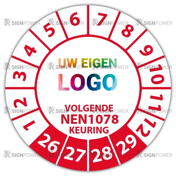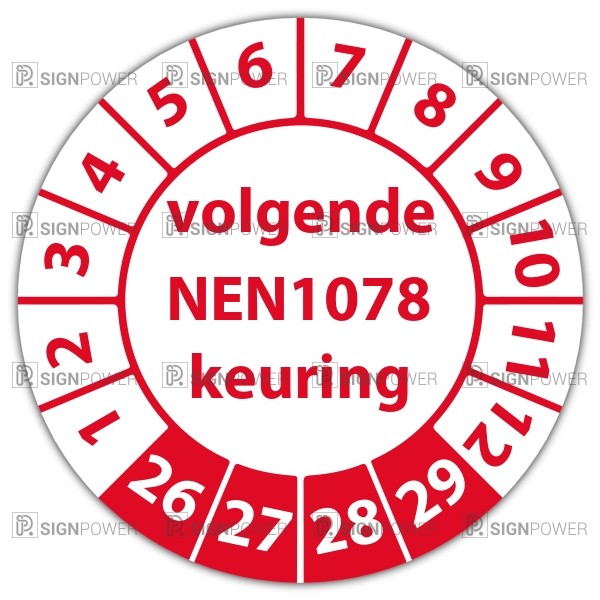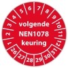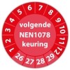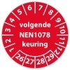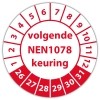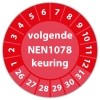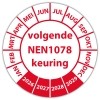 De keuringssticker "volgende nen 1078 keuring" heeft een diameter van 20mm, 30mm of 40mm. U kunt tevens kiezen voor een begin jaartal en het aantal keuringsstickers op vel.