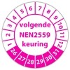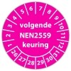 De keuringssticker "volgende nen 2559 keuring" heeft een diameter van 20mm, 30mm of 40mm. U kunt tevens kiezen voor een begin jaartal en het aantal keuringsstickers op vel.