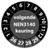 Onze keuringsstickers NEN3140 zijn specifiek ontworpen om te voldoen aan de eisen van de NEN3140 normen voor elektrisch gereedschap. Deze stickers zijn een essentieel onderdeel van het veiligheidsbeleid van jouw bedrijf en helpen bij het identificeren van gereedschap dat regelmatig moet worden geïnspecteerd en gekeurd volgens de NEN3140 richtlijnen.