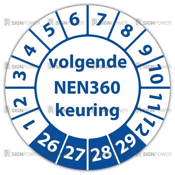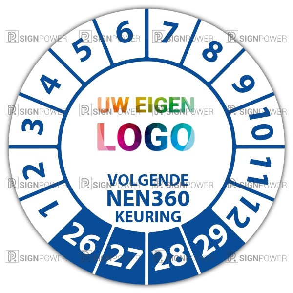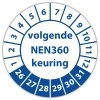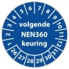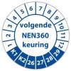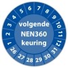 De keuringssticker "volgende nen 360 keuring" heeft een diameter van 20mm, 30mm of 40mm. U kunt tevens kiezen voor een begin jaartal en het aantal keuringsstickers op rol.