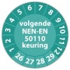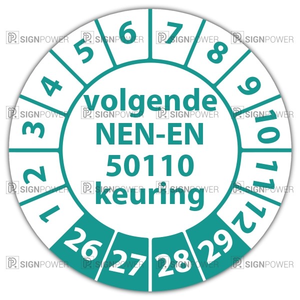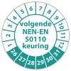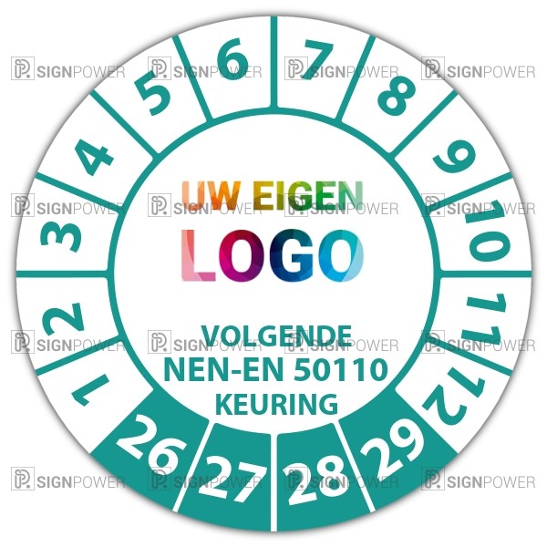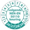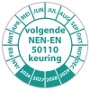 De keuringssticker "volgende nen-en 50110 keuring" heeft een diameter van 20mm, 30mm of 40mm. U kunt tevens kiezen voor een begin jaartal en het aantal keuringsstickers op rol.