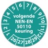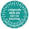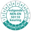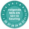 In de categorie keuringsstickers op vel is de keuringssticker "volgende nen-en 50110 keuring" een veel gebruikte zelfklevende sticker. Het is volgens de wet vereist dat een bewijs van de uitgevoerde keuring op de werkplek aanwezig moet zijn. Een keuringsstickers op vel gemaakt van een (matte) niet scheurbaar PP vinyl is daarvoor de meest praktische oplossing. Indien de sticker in aanraking komt met vocht adviseren wij een laminaatlaag over de stickers te laten aanbrengen, dit verlengt tevens de levensduur van de stickers.