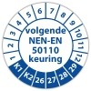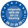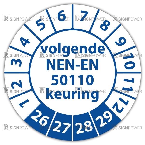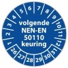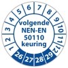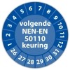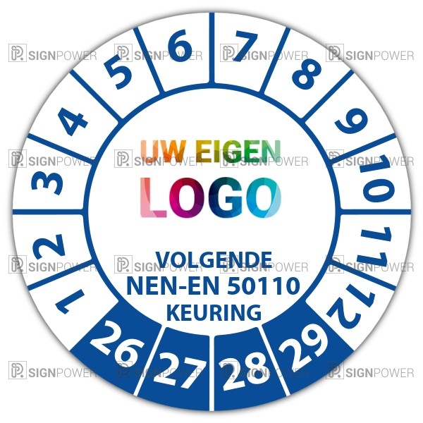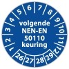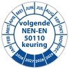 De keuringssticker "volgende nen-en 50110 keuring" heeft een diameter van 20mm, 30mm of 40mm. U kunt tevens kiezen voor een begin jaartal en het aantal keuringsstickers op vel.