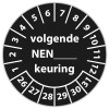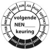 In de categorie keuringsstickers nen-normen is de keuringssticker volgende nen-norm keuring (eigen invoer) een veel gebruikte zelfklevende sticker. Het is volgens de wet vereist dat een bewijs van de uitgevoerde keuring op de werkplek aanwezig moet zijn. Een keuringsstickers nen-normen gemaakt van een (matte) niet scheurbaar PP vinyl is daarvoor de meest praktische oplossing. Indien de sticker in aanraking komt met vocht adviseren wij een laminaatlaag over de stickers te laten aanbrengen, dit verlengt tevens de levensduur van de stickers.