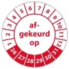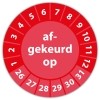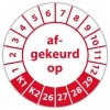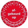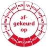 In de categorie kunt u zelf de tekst kleur en lettertype bepalen. Rechthoek, ovaal, rond of vierkant in diverse maten. De keuringssticker "afgekeurd op" is gedrukt op een (matte) zelfklevend niet scheurbaar PP vinyl. Ten op zichte van papieren stickers zijn deze watervast. Uw stickers worden afgeleverd in een handig doosje
