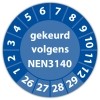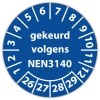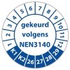 keuringssticker voor het keuren /controleren van elektrische installaties als gereedschappen, machines volgens de norm NEN3140 te leveren op zelfklevend vinyl . standaard uitvoering of met eigen tekst en/of logo in diverse vormen en maten
