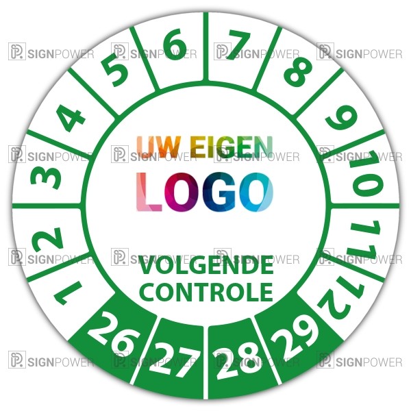 In de categorie kunt u zelf de tekst kleur en lettertype bepalen. Rechthoek, ovaal, rond of vierkant in diverse maten. De keuringssticker "volgende controle" is gedrukt op een (matte) zelfklevend niet scheurbaar PP vinyl. Ten op zichte van papieren stickers zijn deze watervast. Uw stickers worden afgeleverd in een handig doosje