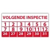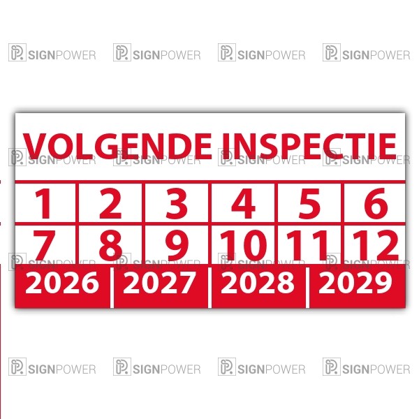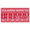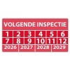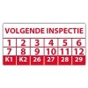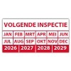 In de categorie kunt u zelf de tekst kleur en lettertype bepalen. Rechthoek, ovaal, rond of vierkant in diverse maten. De keuringssticker "volgende inspectie" is gedrukt op een (matte) zelfklevend niet scheurbaar PP vinyl. Ten op zichte van papieren stickers zijn deze watervast. Uw stickers worden afgeleverd in een handig doosje